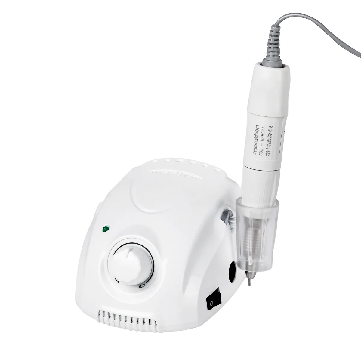 Die Drehzahl lässt sich über einen Drehknopf von bis zu 35.000 Umdrehungen pro Minute einstellen, wodurch Sie sie an Ihre individuellen Bedürfnisse anpassen und so bequem eine Vielzahl von Behandlungen durchführen können. Zudem leuchtet die Kontrollleuchte grün, so dass leicht zu erkennen ist, ob die Fräse mit minimaler Drehzahl läuft. Die Arbeit mit dem Gerät ist extrem einfach, effektiv und intuitiv, was auch anspruchsvollere Benutzer zu schätzen wissen.
